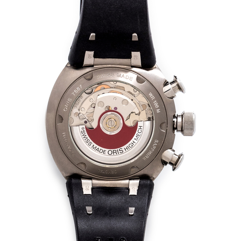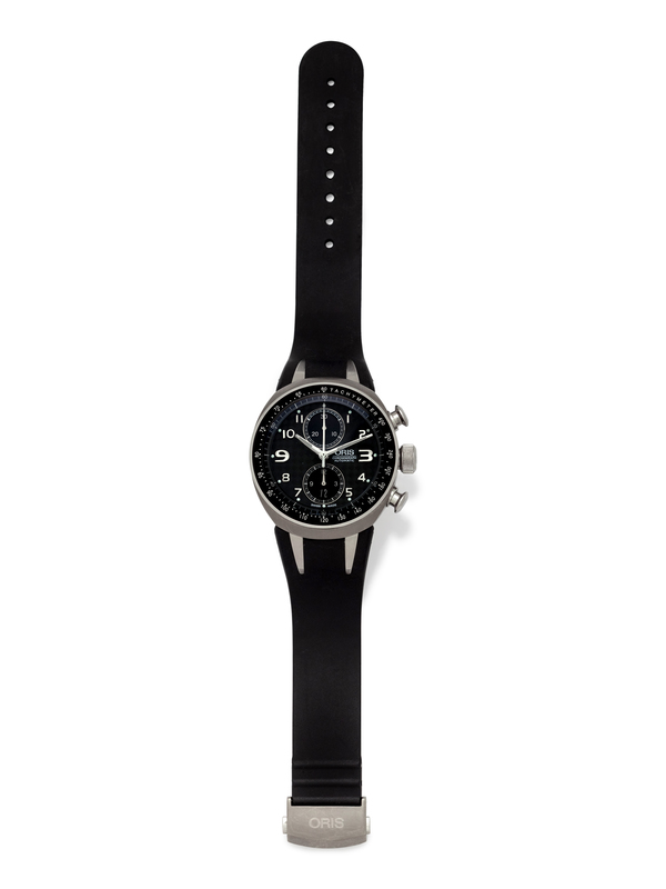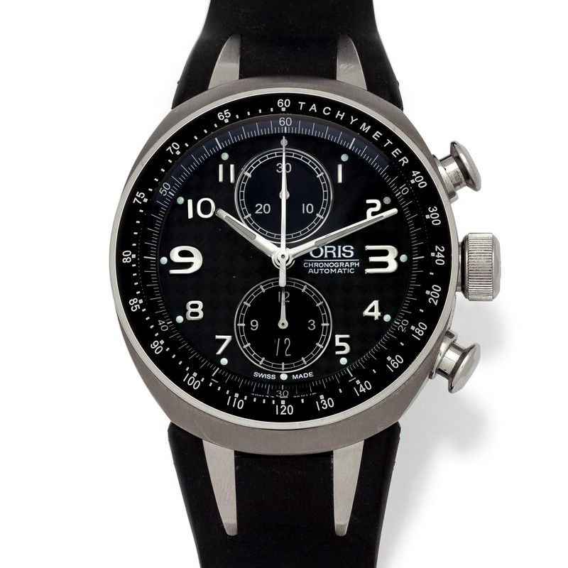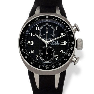 no. 2834/3000, 43.00 mm case diameter, black fiber carbon dial signed ORIS with inner minute track, applied Arabic numerals, luminous steel baton hands with chronograph seconds hand, subdials at 12 and 6 o'clock for chronograph minutes and hours respectively, black tachymeter bezel, chronograph pushers at 2 and 4 o'clock respectively, screw on case back with exhibition crystal, Cal. 673 25 jewel self-winding movement, rubber strap with titanium foldover clasp signed ORIS.