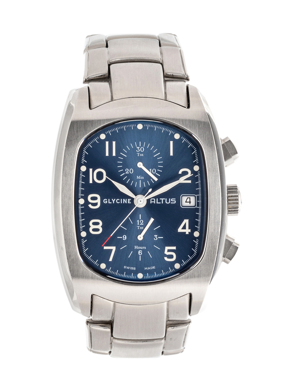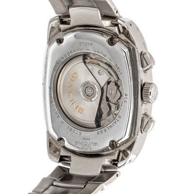 38.00 x 52.00 mm case dimensions inclusive of lugs, blue dial signed GLYCINE, luminous Arabic and dot numerals, luminous sword hands with chronograph seconds hand, subdials at 12 and 6 o'clock for chronograph minutes and hours, date aperture at 3 o'clock, chronograph pushers at 2 and 4 o'clock, case back affixed by four screws with exhibition crystal, Cal. 7750 25 jewel self-winding movement, link bracelet signed GLYCINE, double deployant clasp.