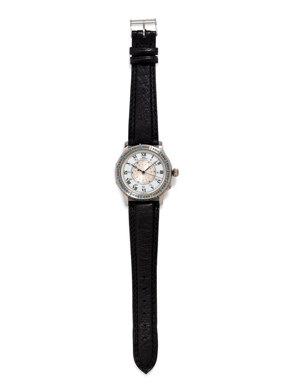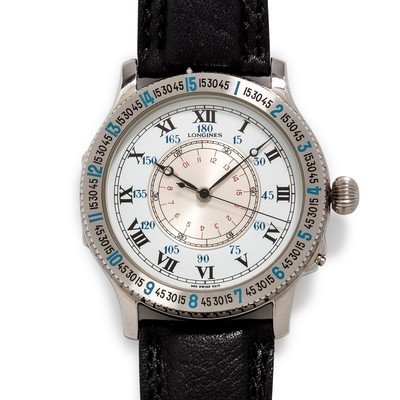 36.00 mm case diameter, white dial signed LONGINES, Roman numbers with inner blue Arabic chapter ring for longitude calculations, central rotating silvered disc for radio time signal seconds synchronization, bidirectional rotating bezel with daily variations in the equation of time, black moon hands with center sweep seconds, hinged case back, exhibition crystal, Cal. 989.2 25 jewel self-winding nickel movement, black leather strap signed LONGINES, silver tone tang buckle.