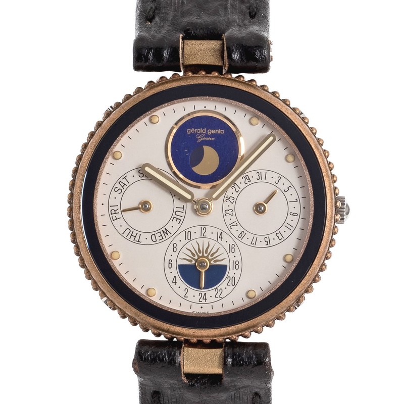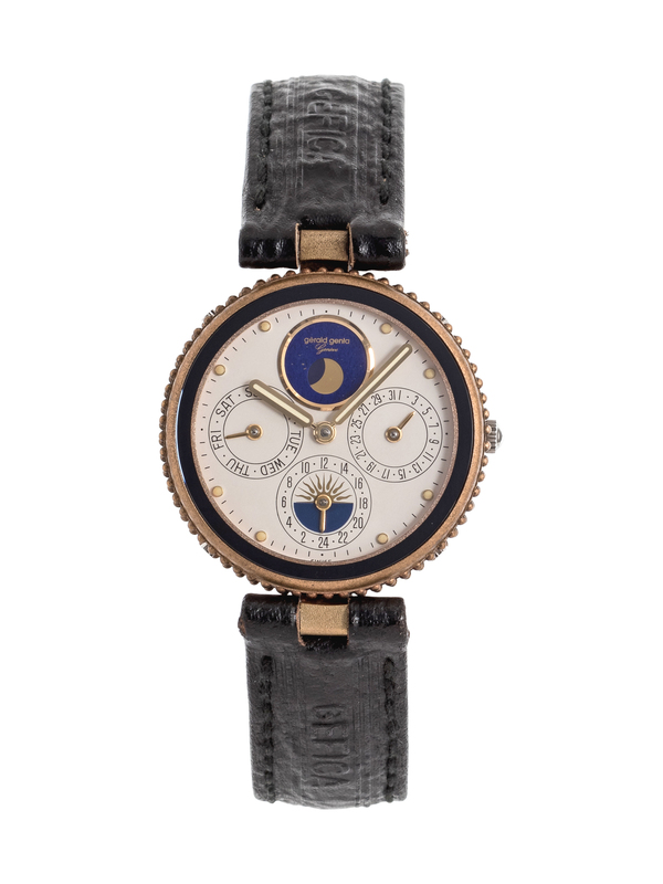 33.00 mm case diameter, matte silvered dial signed Gerald Genta, luminous dot numerals, subdial at 12 o'clock for moonphase indication, subdials at 3, 6 and 9 o'clock for date, 24 hour indication and day of the week respectively, luminous gold tone baton hands, quick set buttons in the case at 1, 5, 7 and 11, round case with hobnail bezel, snap on case back, quartz movement, T-bar lugs with attached black leather strap signed GEFICA, bronze deployant buckle.