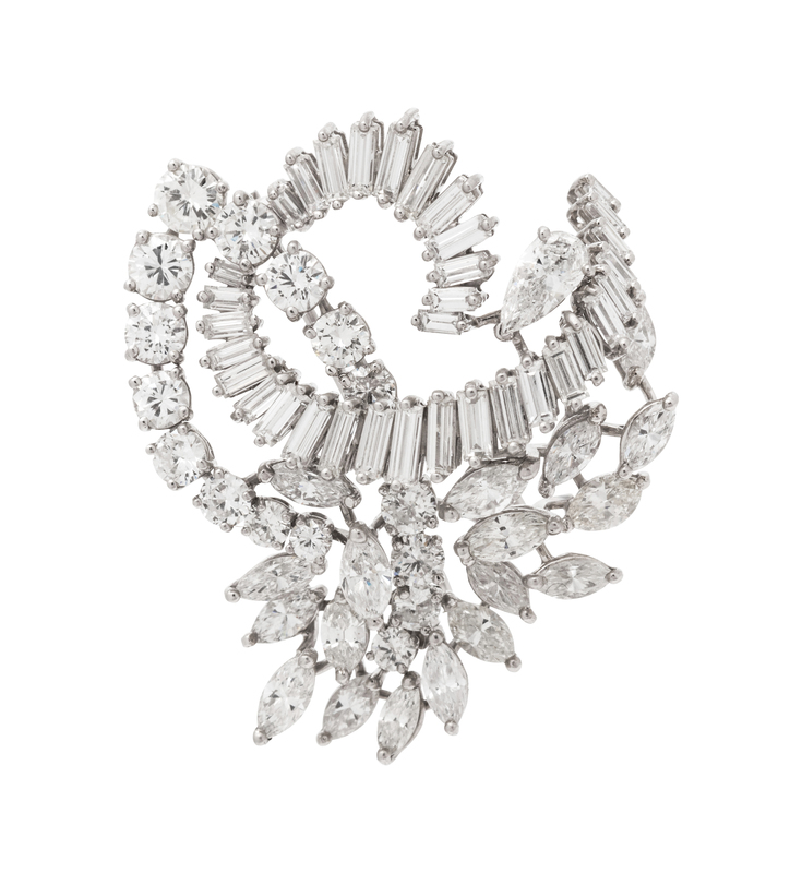 containing 17 round brilliant cut diamonds weighing approximately 2.45 carats total, one pear shape brilliant cut diamond weighing approximately 0.30 carat, 18 marquise cut diamonds weighing approximately 3.00 carats total and 33 baguette cut diamonds weighing approximately 1.75 carats total.