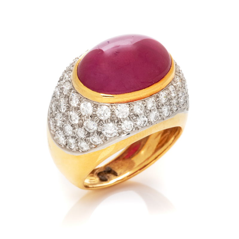 containing one oval cabochon cut ruby measuring approximately 15.00 x 10.85 x 6.55 mm and 65 round brilliant cut diamonds weighing approximately 1.95 carats total.