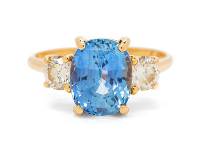 containing one oval shape mixed cut sapphire measuring approximately 9.50 x 7.60 x 5.80 mm and two round brilliant cut diamonds weighing approximately 0.55 carat total.