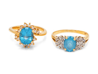 A Collection of 14 Karat Yellow Gold, Blue Topaz and Diamond Rings,