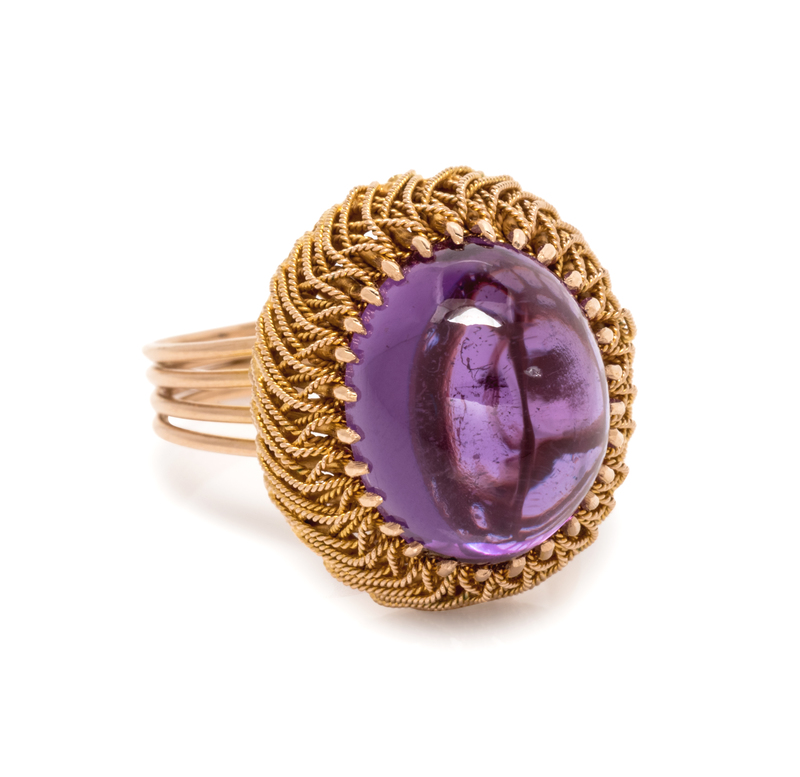 containing one oval shape cabochon cut glass measuring approximately 14.00 x 11.20 mm with twisted wire surround.