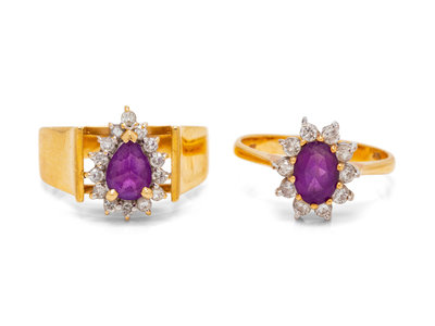 consisting of a ring containing one pear shape mixed cut amethyst and 14 round brilliant cut diamonds weighing approximately 0.15 carat total, together with a ring containing one oval shape mixed cut amethyst and 10 round brilliant cut diamonds weighing approximately 0.20 carat total.