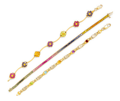 consisting of a bracelet containing numerous rectangular mixed cut sapphires in graduating colors, a bracelet containing alternating brushed white gold links with five round mixed cut gemstones of various color, together with a bracelet containing seven floral motif links containing round mixed cut multicolored gemstones of various colors.
