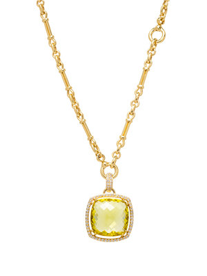 containing one cushion shape checkerboard cut quartz measuring approximately 19.75 x 19.75 x 9.10 mm and 64 round brilliant cut diamonds weighing approximately 0.50 carat total, suspended from a fancy link chain.