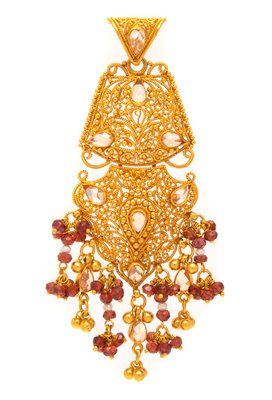 consisting of the bale and two hinged sections in the pendant containing eight pear shape rose cut simulant stones and seven tassels, containing three pear shape rose cut simulant stones, four seed pearl beads and numerous faceted gemstone beads.