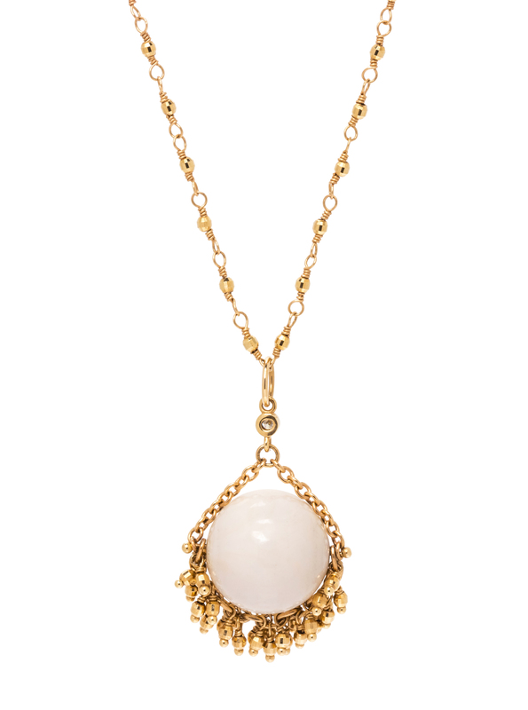 containing one round agate bead measuring approximately 14.20 mm in diameter, one round brilliant cut diamond weighing approximately 0.02 carat total, suspended from a fancy link chain, with gold fringe.