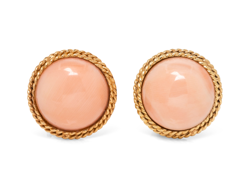 containing two round cabochon cut coral measuring approximately 13.00 mm in diameter.