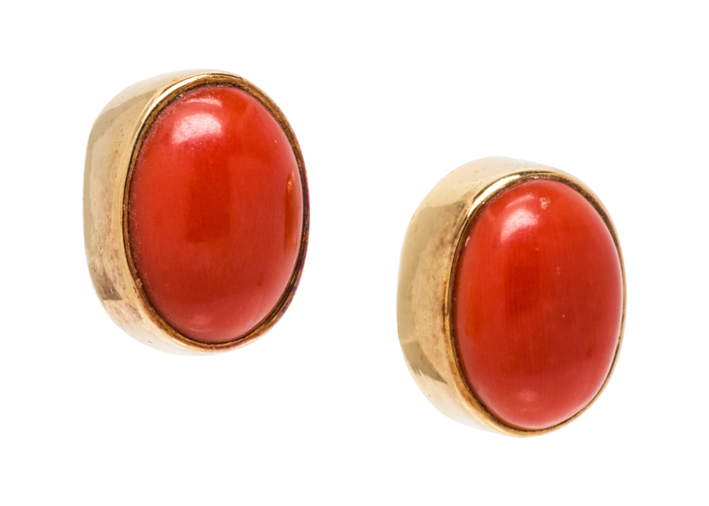 containing two oval cabochon cut coral measuring approximately 13.60 x 9.70 mm, clip backs with 14 karat gold posts.