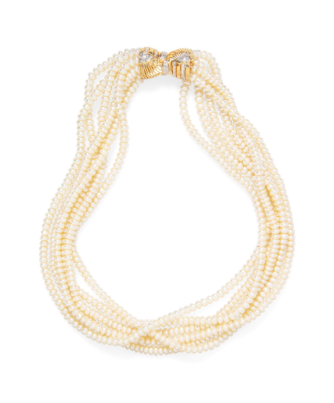 consisting of six strands of pearls measuring approximately from 4.90-5.15 mm wide, the clasp with numerous single cut diamonds.