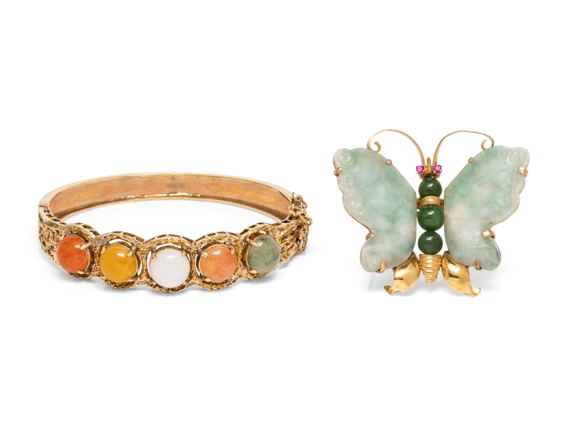 consisting of a 14 karat gold bangle bracelet containing five round cabochon cut quartz, nephrite and carnelian stones, together with a butterfly brooch containing three nephrite beads, two nephrite wing plaques measuring approximately 31.00 x 25.00 mm and two ruby eyes.
