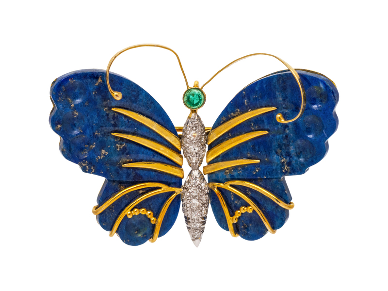 A Yellow Gold, Platinum, Diamond, Emerald and Lapis Lazuli Butterfly Pendant/Brooch,