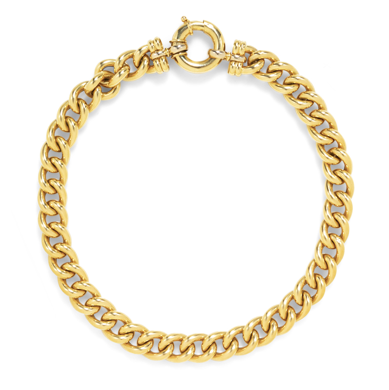 consisting of a curb link chain measuring approximately 15.00 mm wide with an oversize lobster clasp.