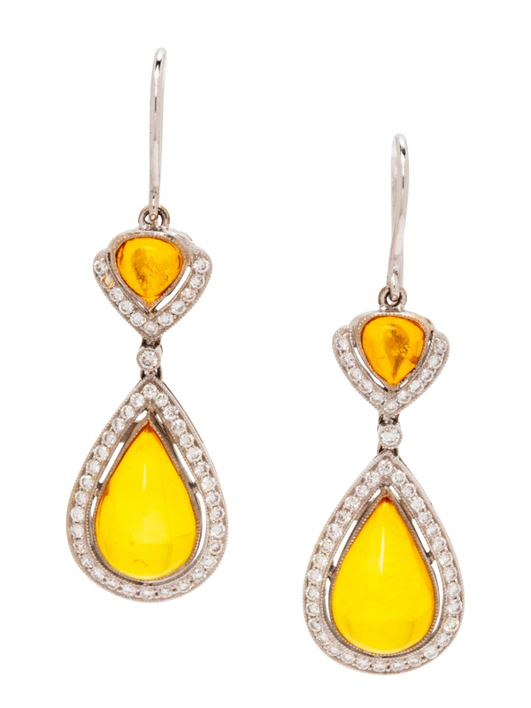 A Pair of 18 Karat White Gold, Amber and Diamond Earrings,