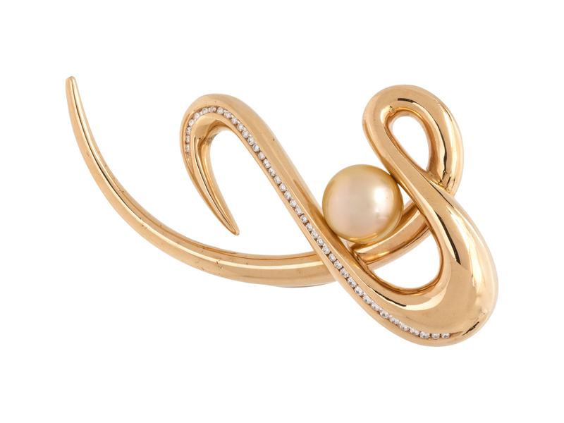 A 14 Karat Yellow Gold, Cultured South Sea Pearl and Diamond Brooch,