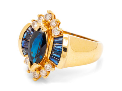 containing one marquise cut sapphire measuring approximately 9.60 x 5.15 mm, eight calibre cut sapphires and 10 round brilliant cut diamonds weighing approximately 0.25 carat total.