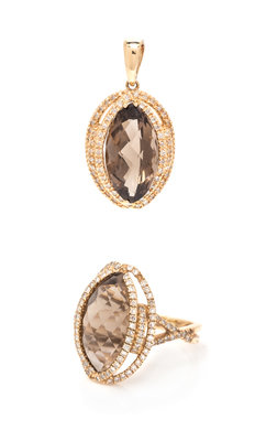 consisting of a pendant containing one marquise shape checkerboard cut smoky quartz and 70 round brilliant cut diamonds weighing approximately 0.35 carat total, together with a ring containing one marquise shape checkerboard cut smoky quartz and 106 round brilliant cut diamonds weighing approximately 0.50 carat total.