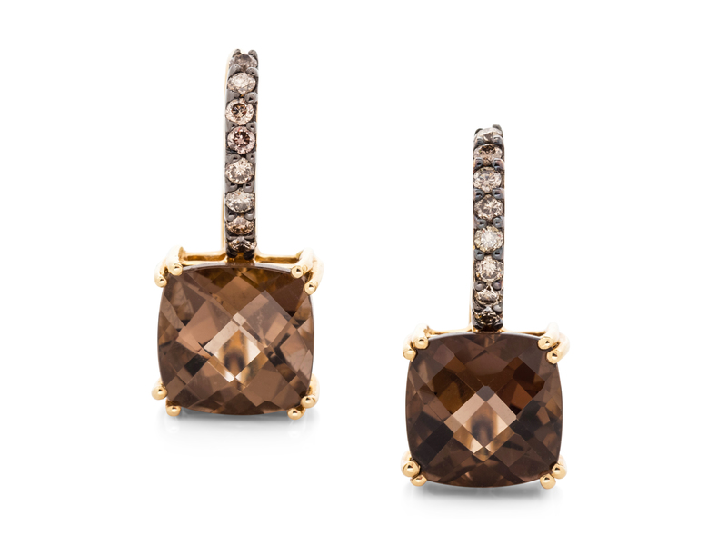 containing two cushion shape checkerboard cut smoky quartz and 16 round brilliant cut brown diamonds (origin of color not tested) weighing approximately 0.25 carat total.