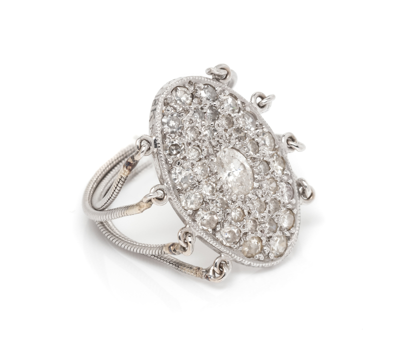 comprised of an oval shape plaque containing one oval shape diamond weighing approximately 0.12 carat and 35 single cut diamonds weighing approximately 0.30 carat total and quadruple snake chain shank.