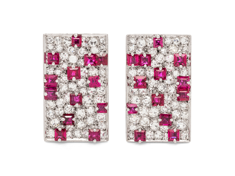A Pair of 18 Karat White Gold, Diamond and Ruby Earclips, H. Stern,