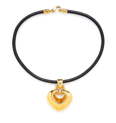 consisting of a puffed heart pendant signed BVLGARI suspended from a black leather cord with 18 karat yellow gold lobster clasp.
