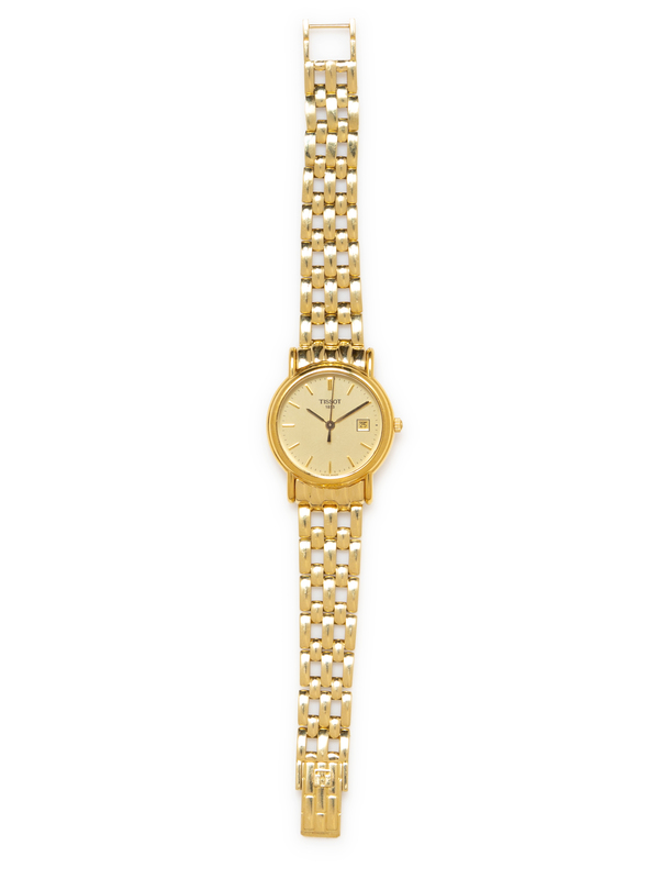 25.00 mm case diameter, matte gold dial signed TISSOT, gold baton numerals, gold pencil hands with center sweep seconds hand, date aperture at 3 o'clock, case back affixed with six screws, quartz movement, link bracelet measuring approximately 13.00-11.00 mm wide, fold over clasp.