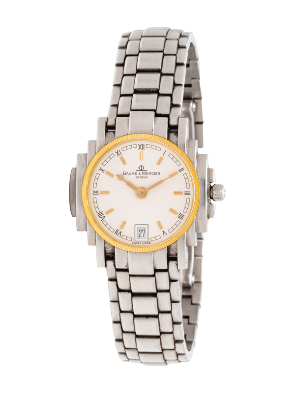 25.00 x 29.00 mm case diameter, white matte dial signed Baume & Mercier, applied gold baton numerals and black Roman numerals, date aperture at 6 o'clock, gold hands, screw on case back, quartz movement, steel link bracelet with deployant clasp.