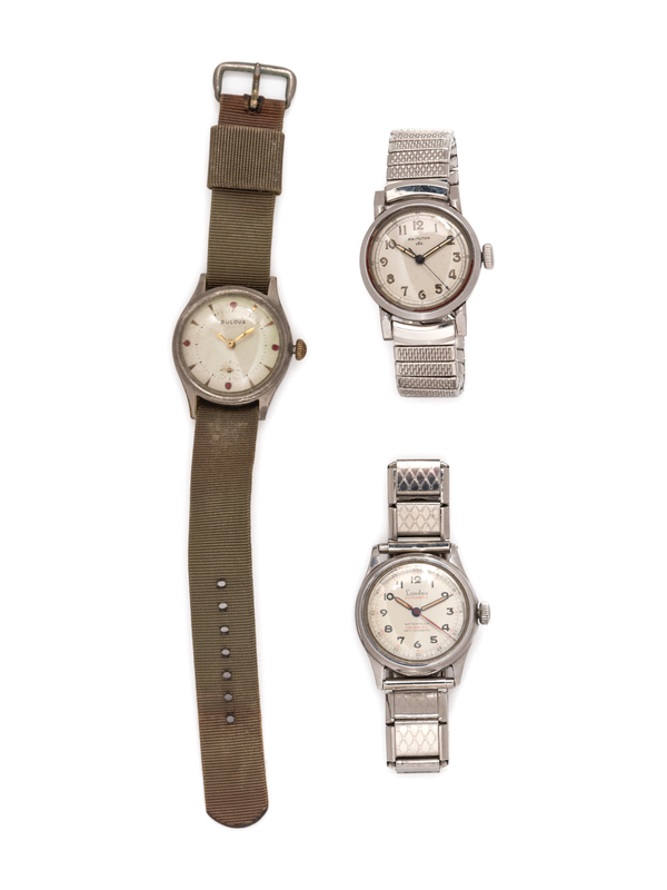consisting of one watch with 29.00 mm case diameter, off-white dial signed BULOVA, gold tone triangle and red circle numeral markers, gold tone modern hands, subdial for seconds at 6 o'clock, screw down case back, army green fabric strap, steel tang buckle, a stainless steel watch with 30.00 mm case diameter, matte silvered dial signed Landau, black Arabic numerals, luminous modern hands, screw down case, expandable steel bracelet, together with a stainless steel watch with 30.00 mm case diameter, matte silvered dial signed HAMILTON, luminous Arabic numerals, luminous modern hands, snap on case back, expandable steel bracelet.