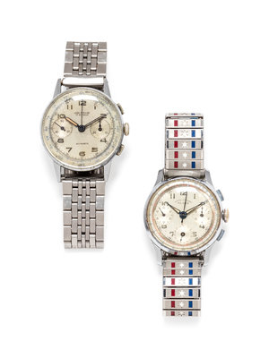 consisting of a stainless steel watch with 34.00 mm case diameter, matte silvered dial signed ORATOR, Arabic numerals, outer tachometer chapter ring, blued steel radium hands, center sweep seconds, 30 minute subdial at 3 o'clock, 60 second subdial at 9 o'clock, snap on case back, later matte link bracelet, deployant clasp, a stainless steel watch with 33.00 mm case diameter, matte silver single sunk dial signed ALSTA, luminous Arabic numerals with outer telemeter chapter track, luminous blued steel alpha hands, 30 minute subdial at 3 o'clock, subdial at 6 o'clock, 60 second subdial at 9 o'clock, later Uniflex bracelet with red and blue and white star links.