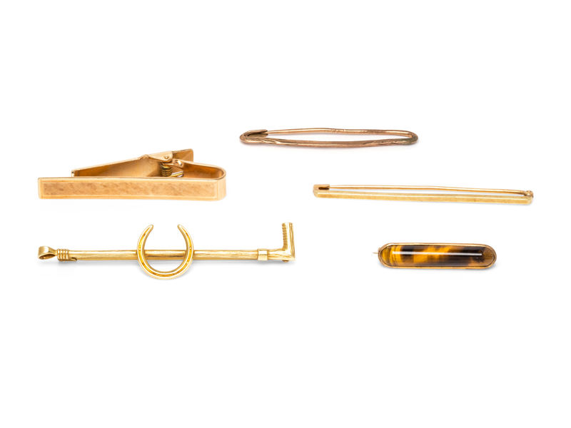 consisting of a 14 karat bar brooch, a 10 karat gold bar brooch, a 14 karat money clip, a yellow gold and tiger's eye brooch, together with a 14 karat crop and horseshoe motif pendant/brooch.