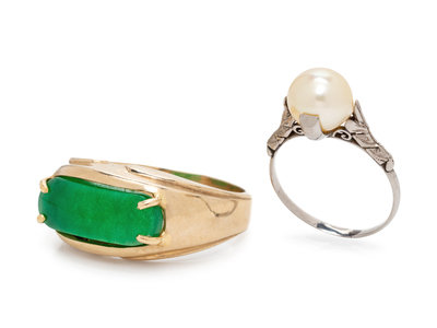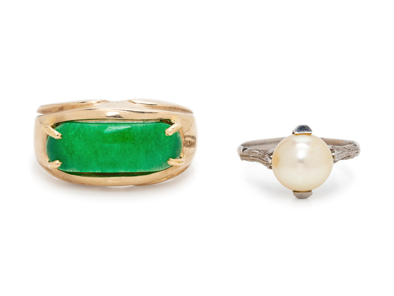 consisting of a yellow gold ring containing one dyed green quartz plaque, together with a silver ring containing one cultured pearl measuring approximately 8.50 mm in diameter.