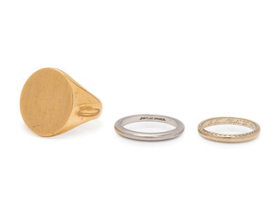 containing a platinum band, a 14 karat white gold signet ring, and an 18 karat yellow gold engraved band.