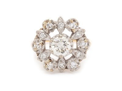 containing one round brilliant cut diamond weighing approximately 0.85 carat and 12 round brilliant cut diamonds weighing approximately 0.30 carat total.