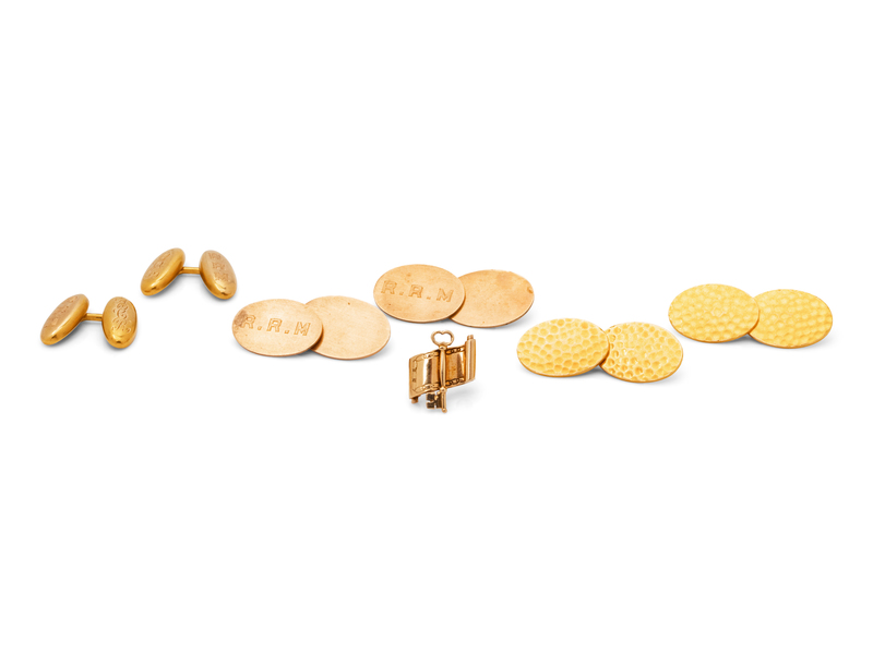consisting of two pairs of R.R.M. monogram engraved oval shape cufflinks, a pair of 18 karat gold oval shape cufflinks with hammered texture, together with a key and scroll society pin.