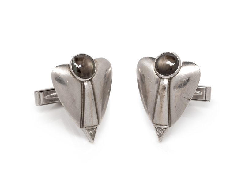 containing two round cabochon cut black star sapphires measuring approximately 6.90 mm in diameter and two triangular step cut diamonds weighing approximately 0.20 carat total.