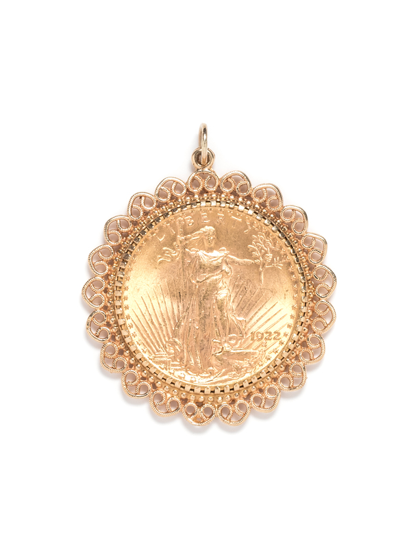 containing one US $20 Liberty head gold coin, dated 1922, in a yellow gold openwork bezel setting.