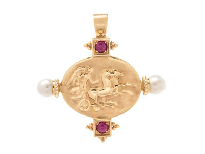consisting of an oval plaque depicting a horse drawn chariot, two pearls measuring approximately 6.40 mm in diameter and two round cabochon cut rubies measuring approximately 4.00 mm in diameter.