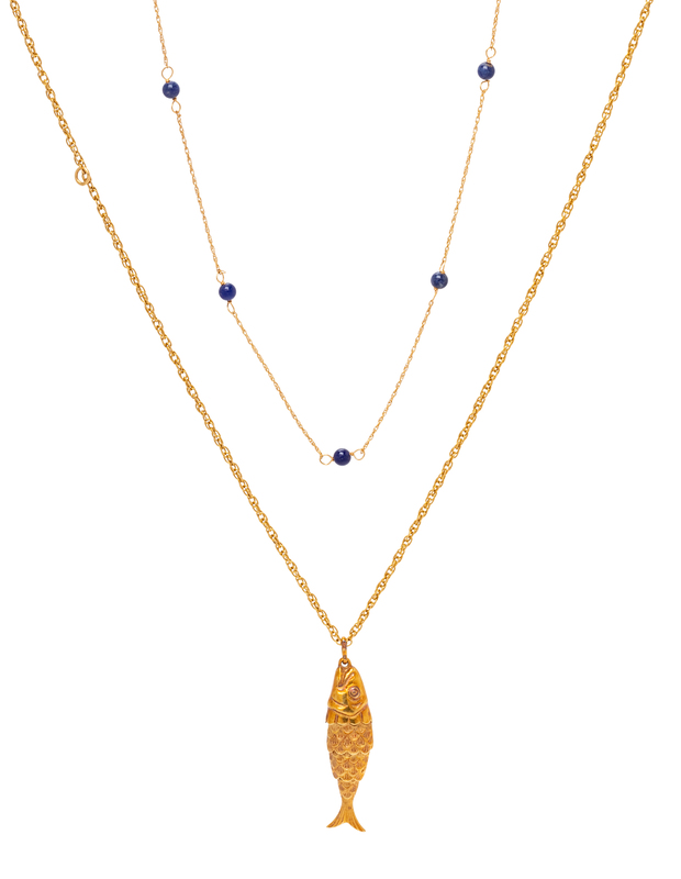 consisting of a wheat chain necklace interspersed with seven round lapis lazuli beads, together with an articulated fish pendant suspended from a wheat chain necklace.