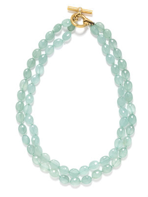 consisting of two strands of aquamarine beads, measuring approximately 10.95 x 9.10 mm, strung knotted with toggle clasp containing nine round brilliant cut diamonds.