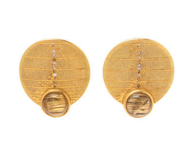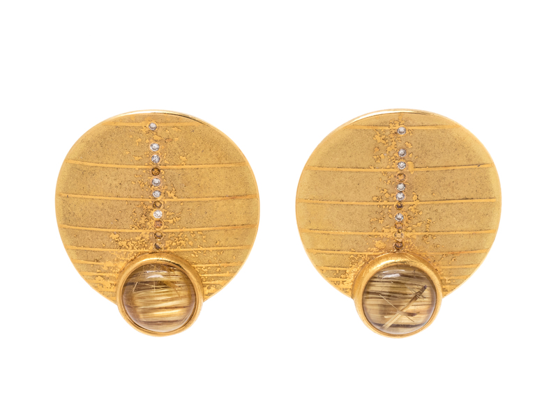 containing two round cabochon cut rutilated quartz and 20 round brilliant cut diamonds and colored diamonds (origin of color not tested).