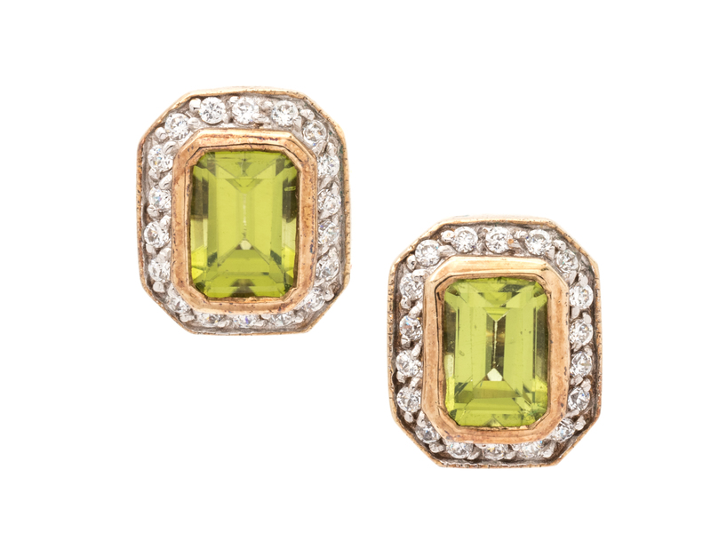 containing two octagonal step cut peridot measuring approximately 6.95 x 4.85 mm and 36 round brilliant cut diamonds weighing approximately 0.15 carat total.