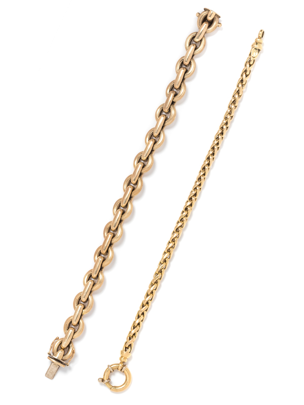 consisting of a 14 karat gold link bracelet with oval shape ribbed links measuring approximately 10.50 mm wide, together with an 18 karat gold wheat chain bracelet measuring approximately 4.95 mm wide.