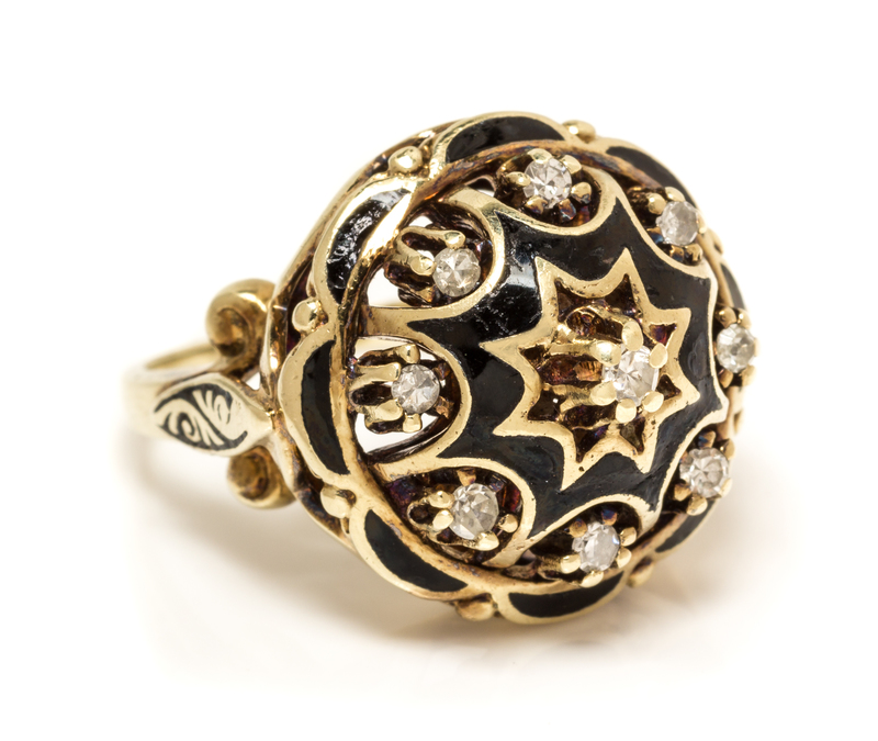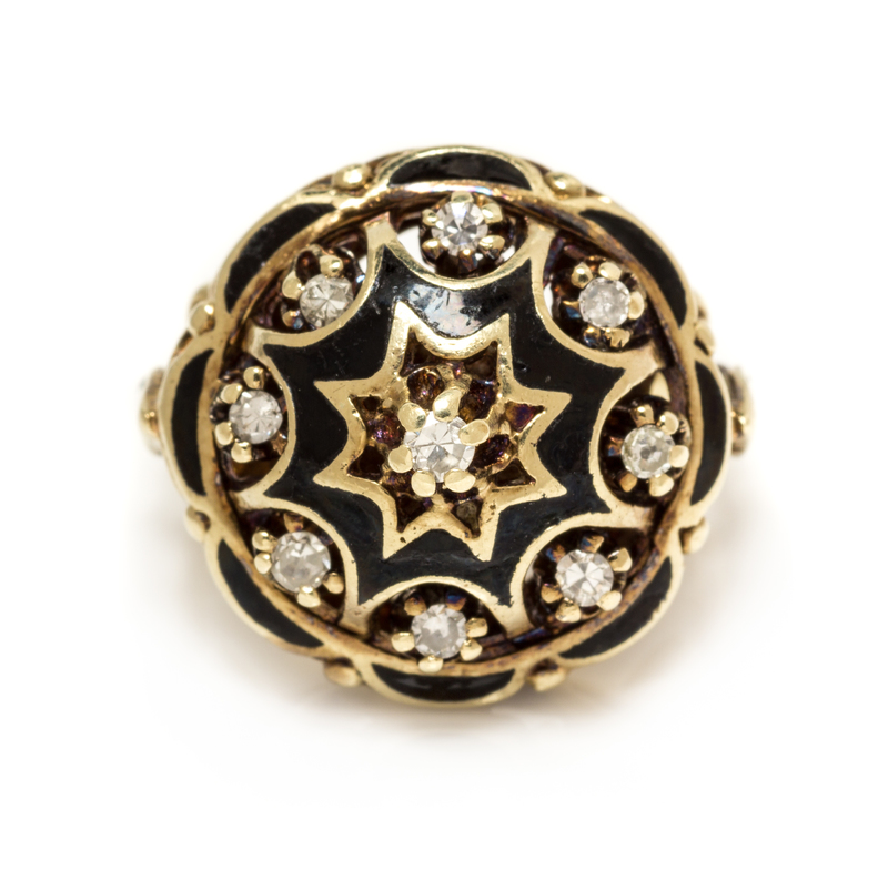 A 14 Karat Yellow Gold, Diamond and Enamel Ring,