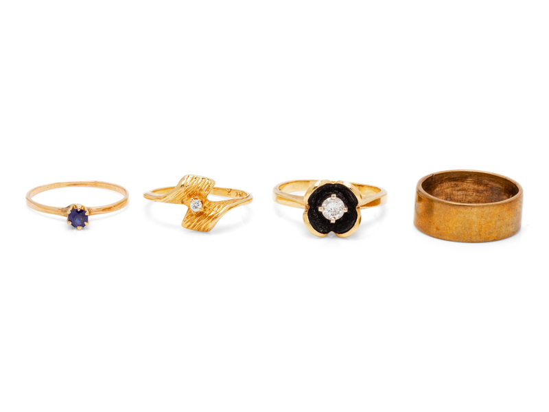 consisting of a yellow gold band, a yellow gold ring containing one round mixed cut sapphire measuring approximately 3.30 mm in diameter, a 14 karat gold ring containing one round brilliant cut diamond weighing approximately 0.03 carat, together with a 14 karat gold flower motif ring containing one round brilliant cut diamond weighing approximately 0.20 carat.