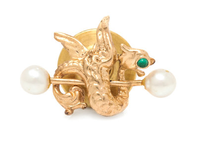 containing one round cabochon cut emerald measuring approximately 1.30 mm in diameter and two cultured pearls measuring approximately 3.90 mm in diameter, designed as a dragon holding a scepter.