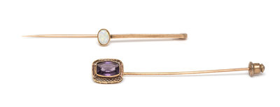 consisting of a stick pin containing one oval shape cabochon cut opal measuring approximately 5.60 x 4.10 mm and a stick pin containing a cushion shape mixed cut purple glass within an openwork surround.