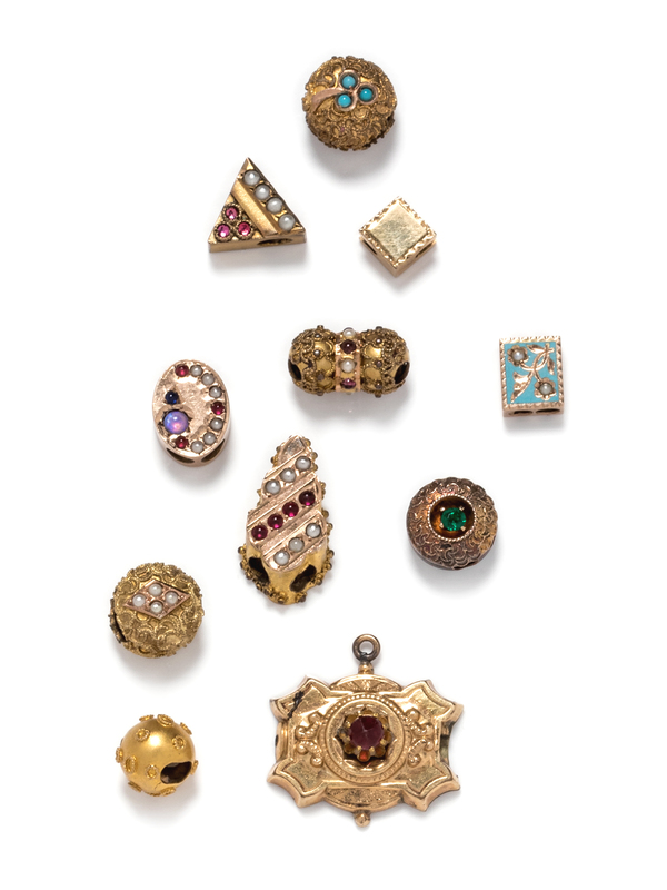 consisting of two yellow gold rope chains strung with various shaped charm beads containing gemstones including opal, turquoise, seed pearl and diamond, together with 11 charm beads.
